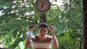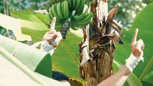 In this work the Puerto Rican artist Javier Bosques literally confronts the cultural legacy of the region. In the video Peleando con la pámpana, Bosques is having a fist fight with the flower of the banana tree, the pámpana. The artist punches the enormous flower until it breaks off from the stalk and the sap starts to drip from the tree. At the end of the fight Bosques leans on a farmers’ weighing scale, looks at the camera and asks, “And now who is the best pound for pound?” In Puerto Rico the expression “have the banana stain” refers to the Boricuan people and is used with pride to signal the culture, language and ways of life relating to this collective. The saying alludes to the stain left by the banana tree sap when the fruit is cut (a fundamental component of the local diet). Through this symbolic conflict, Bosques challenges the clichés constructed around the banana and boxing as elements of Puerto Rican identity.